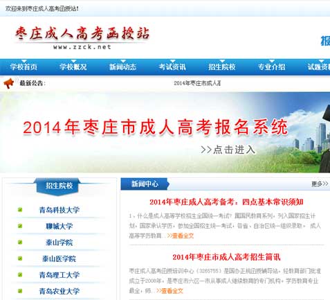 所屬行業(yè):教育 單位名稱:棗莊成人高考函授站-棗莊網(wǎng)站建設(shè)項目網(wǎng)站地址:http://www.zzck.net