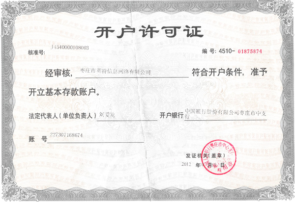 棗莊市英特信息網(wǎng)絡有限公司已經(jīng)三證合一了,下面是公司的新營業(yè)執(zhí)照的副本。棗莊市英特信息網(wǎng)絡有限公司營業(yè)執(zhí)照(統(tǒng)一社會信用代碼:91370402863129563Y)